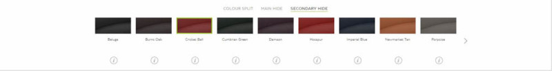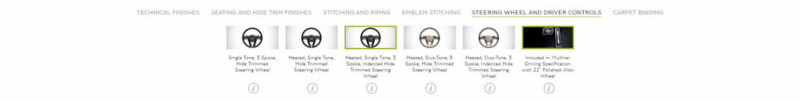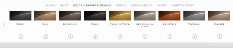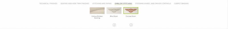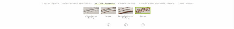 图一图二是内饰面板的纹理选择,一共有十五种可以选择,七种包括拼色七种。中控的金属面板选择只有一款。金属质感强烈且搭配完美。刺绣和缝线也分别有三种和四种可以选择。