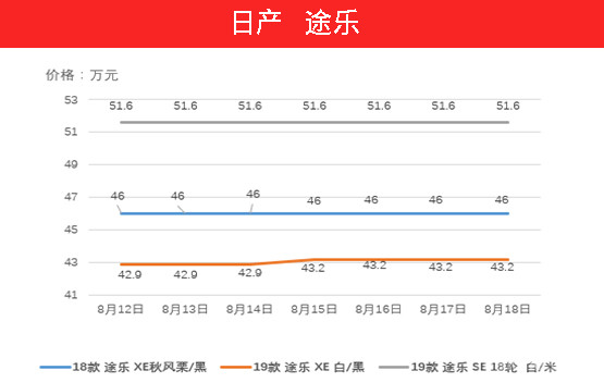 途乐( 参数 | 询价 )的售价较上一周仍有升温。其中XE车型43.2万的价格更是该车型这几个月以来的高点。现如今已经算不上大热色的秋风栗/黑车型与SE18轮白/米车型保持不变。