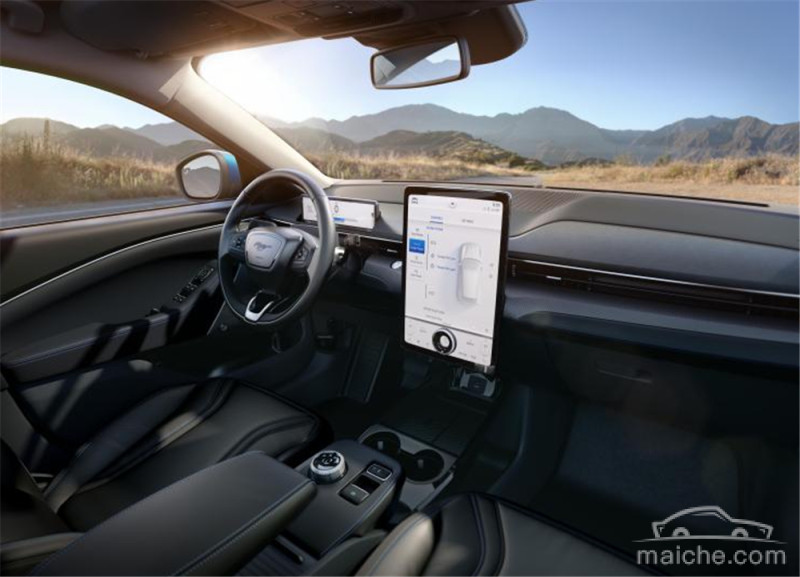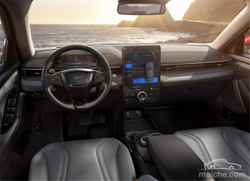 Mach-E的内饰设计风格和大部分电动车一样,主打科技感和极简风,10.2英寸的液晶仪表盘集成了大量驾驶者所需要的信息,同时中控台15.5英寸的大屏搭载了最新版本的SYNC系统,支持苹果Carplay、Android Auto、OTA升级以及语音识别。据厂家表示,这样的设计灵感皆来自于中国消费者需求调研。