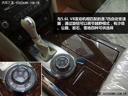 与5.6L V8发动机相匹配的是7挡自动变速器和全新四驱系统,该四驱系统为全时四驱系统,中央差速装置为多片离合器,后桥带有锁止功能的差速器。四驱的控制旋钮设计简洁易懂,分别是AUTO挡、高速四驱挡、低速四驱挡。另外,全新的四轮驱动系统拥有四种行驶模式(沙地、公路、岩石、雪地)可供选择。