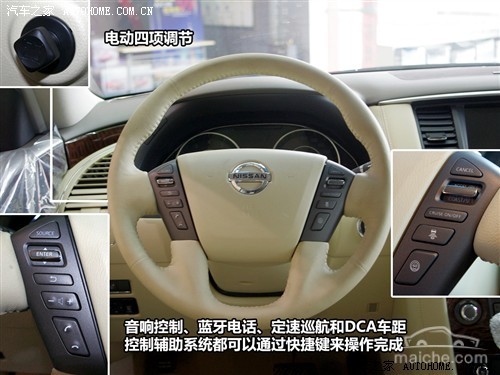 方向盘采用了四幅设计,整体由真皮包裹,不但握感舒适,整体效果也更显沉稳高雅。方向盘上的功能也是相当完备,带有电加热和电动四项调节,音响控制、蓝牙电话、定速巡航和DCA车距控制辅助系统都可以通过快捷键来操作完成。
