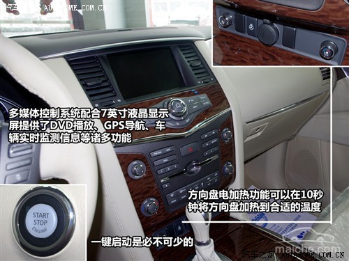 中央触摸屏的尺寸达到了7英寸,并且提供了DVD播放、车辆信息、40G硬盘式GPS导航和全景倒车影像等众多功能。中控台和方向盘布置的繁多功能按键也是一大特色,不过要想完全熟悉,还是需要些时间的。