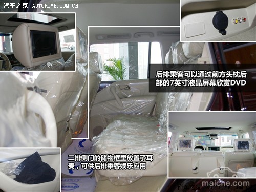 第二排座椅采用独立设计,同样提供了电加热和后排独立空调,样式的材质方面和前排座椅无异。长途旅行中,后排乘客可以通过前排头枕后方的7英寸液晶屏幕欣赏DVD,而旅途的疲劳更可以通过调节第二排座椅角度来达到休息的目的。