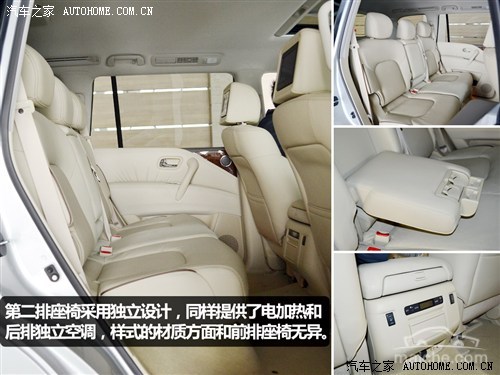 第二排座椅采用独立设计,同样提供了电加热和后排独立空调,样式的材质方面和前排座椅无异。长途旅行中,后排乘客可以通过前排头枕后方的7英寸液晶屏幕欣赏DVD,而旅途的疲劳更可以通过调节第二排座椅角度来达到休息的目的。