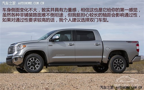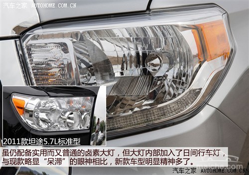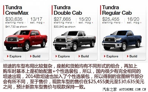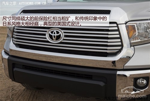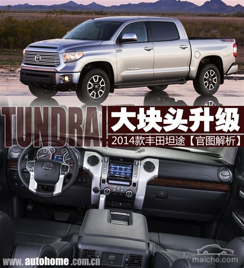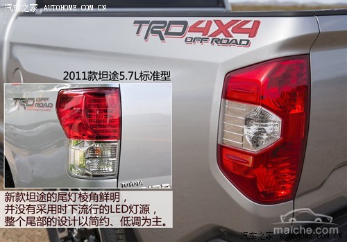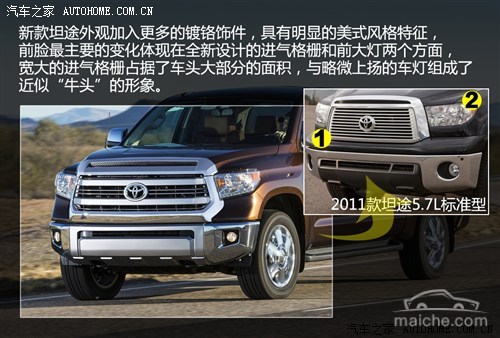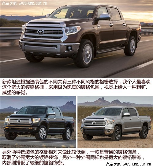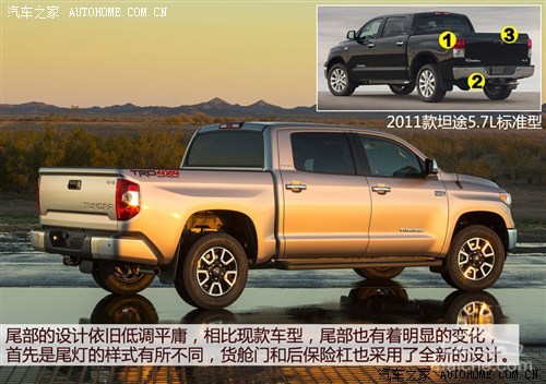 [汽车之家 新车图解] 自2006年丰田推出第二代坦途(TUNDRA)至今,这一代坦途已走过7年的时间,在与福特F150和道奇Ram 1500等同级别车型的对抗中已渐显老态,面对着愈加激烈的竞争,丰田终于在2013年芝加哥车展上发布了2014款丰田坦途,以应对竞争对手强劲的攻势。相比现款坦途,新款坦途最主要的变化在于外观和内饰两个方面,下面,我们通过官图来看看新款坦途的变化之处。