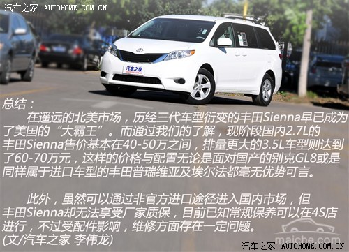 由于丰田Sienna尚未正式引入国内,因此本次拍摄的车型均为通过非官方进口渠道流入国内的美规车型。目前该车仅限部分汽车综合交易市场销售,售价在40-70万元不等,并且无法享受厂家质保。不过通过电话采访我们了解到,丰田Sienna的日常保养可以在广汽丰田或是一汽丰田4S店进行,但维修则视车辆情况而定。