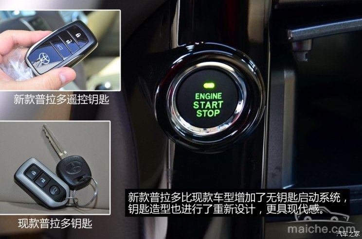 [汽车之家 新车图解] 不久前,丰田发布了新款普拉多的官方图片,从图片上看,重新设计的前脸造型比现款更加夸张,能够给人十分深刻的印象。而在配置方面,新款普拉多也在现款车型的基础上增加了不少舒适性配置。近日,新款普拉多2.7L车型已悄然到店,并将于本周在广州车展正式发布。它与老款相比,除了外观造型有所不同外,对于2.7L车型而言,最大的亮点就是增配了电动天窗,可以说是弥补了老款2.7L车型全系没天窗的遗憾。