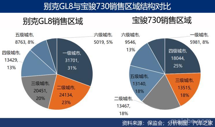 销量第二的宝骏730于2014年上市,在2015年、2016年均创下了超过20万辆的年销售水平,2015年-2018年连续4年斩获年度MPV单车销量冠军,主打四级城市和三级城市,在一级城市销量最低――冠亚军两款车型的区域市场占领路线明显不同,它们也基本代表了合资品牌SUV和中国品牌SUV的竞争格局。