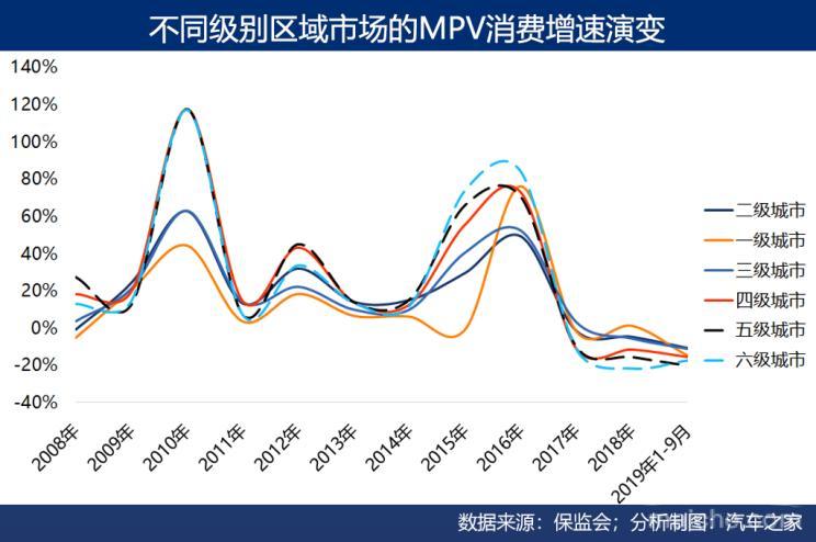 今年前三季度,二级城市MPV消费量累计同比下降10.6%,算是最低的;其次是三级城市,累计同比下降11.4%;一级城市下降14.6%,四级城市下降15.3%,五级城市下降20.3%,六级城市下降17.6%,均高于MPV市场整体降幅。显而易见,下行市场中最先承压、增长疲态最强烈的也正是四五六级城市。而在经济基本面下行压力增大、家庭收入水平增长不力的情况下,这些城市的消费水平也将率先下降,未来为市场增长的贡献度必然下降。