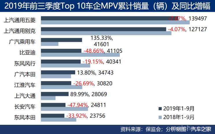 今年前三季度,MPV车企的CR10达到80%,以上汽通用五菱和上汽通用别克为最大玩家。而这十大车企中有7家同比销量下滑,累计降幅最高的是比亚迪,其旗下MPV销量累计同比下降了48.7%,长安汽车下降47.9%,也是一样不好。