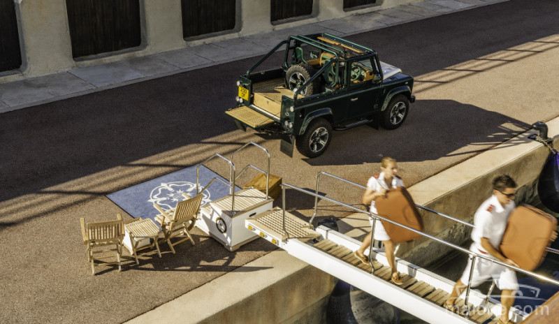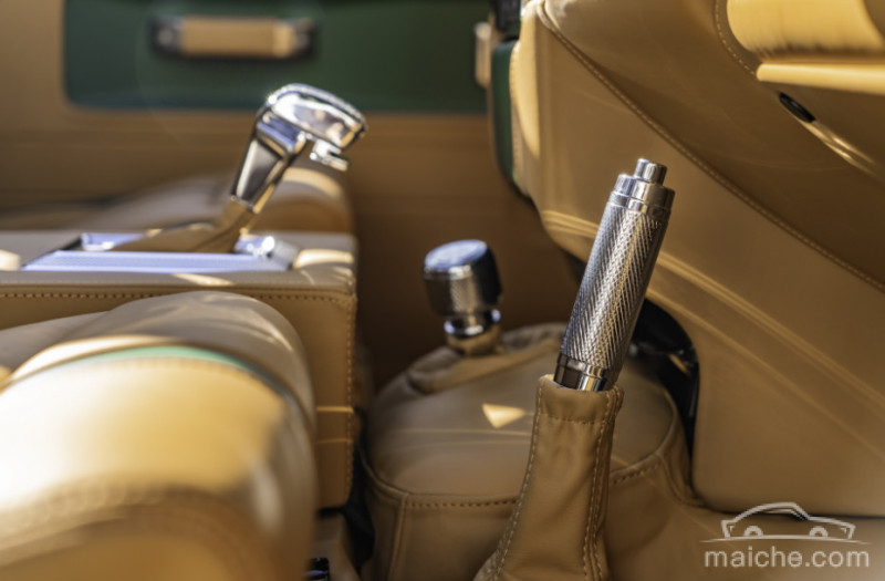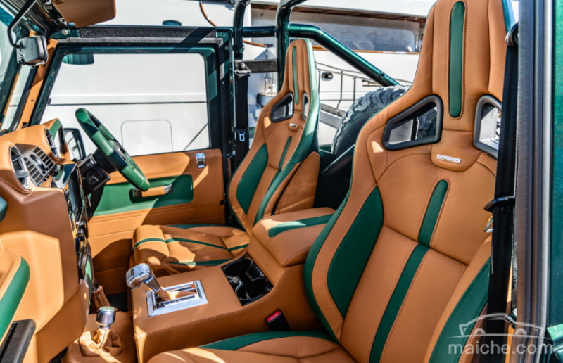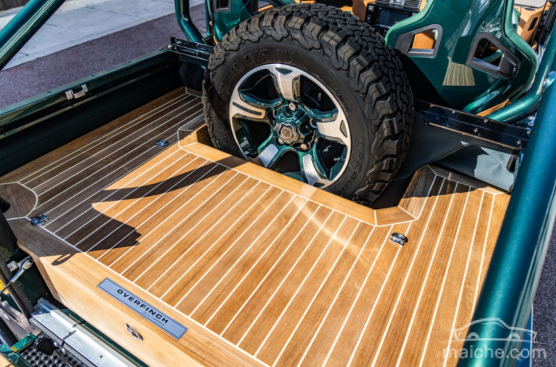 内饰部分,Overfinch以卫士90为基础,拆除了第二排的座椅,采用了柚木货箱地板。为了确保物品安全,有一个可上锁的储物盒,同时放置了一个全尺寸备胎在车尾部。前排装配的是Recaro运动型座椅,该座椅带翠绿色和棕褐色皮革装饰。仪表板和方向盘也采用了皮革材质。门把手、变速杆、手刹、踏板和仪表刻度盘均为镀铬装饰,并带有滚花处理。