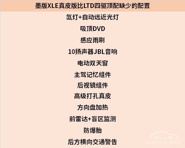 LTD四驱顶配是目前塞纳最高的配置水平,而便宜近12万的墨版XLE真皮版相比之缺少了以下配置: