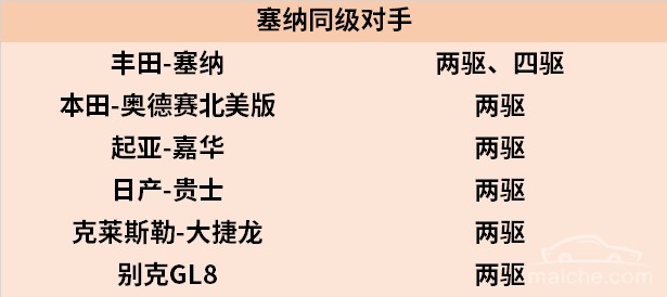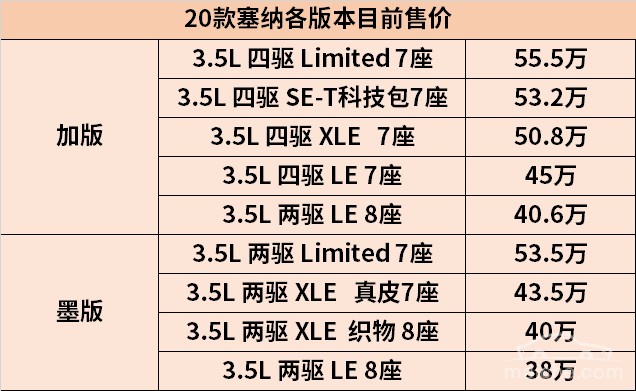 当然墨版车型XLE真皮版也不是没有缺点,首先墨版车型内饰颜色只有灰白色一种,而且只是普通的真皮,缺少打孔,细腻程度也不如顶配LTD车型。另外四驱也是该车型最大的短板,要知道塞纳的同级别对手都是两驱,塞纳也是该级别中唯一提供四驱的MPV车型,买塞纳很多人都是冲着四驱来的。