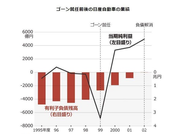 戈恩自从1999年空降到日产后,日产的负债便开始减少,终于在2002年实现了盈亏平衡,日产的经营实现了V字型的复活。其后,戈恩改变了日本汽车企业的采购方式,将系列化的采购改为引入竞争机制,采购的渠道拓宽了,日产的成本开始下降,汽车也有了活力。