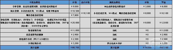 美规X5和中规30i都有配置包可供选择,其配置和价格差异如上表所示。在中规30i选配及选择配置包与美规X5选择配置包后价格为:中规30i售价76.66万,美规X5售价69.7万,差价6.96万。