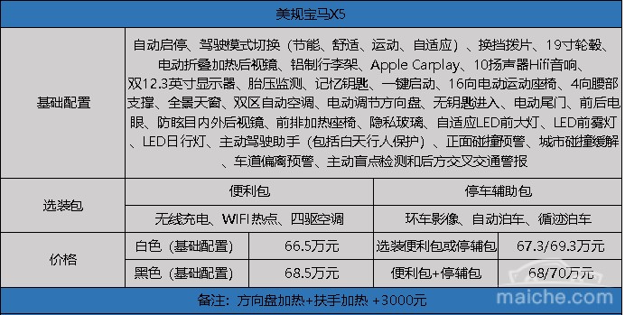 驾驶辅助功能(11000元)、前排座椅电动腰撑(2900元)、带2个USB接口的舒适旅行系统(2500元)需要中规40i M选配。在这些配置选择后,中规40i M售价77.63万,美规X5售价67.8万,差价9.83万。美规X5和中规40i M同样有配置包可供选择,其配置和价格差异如上表所示。