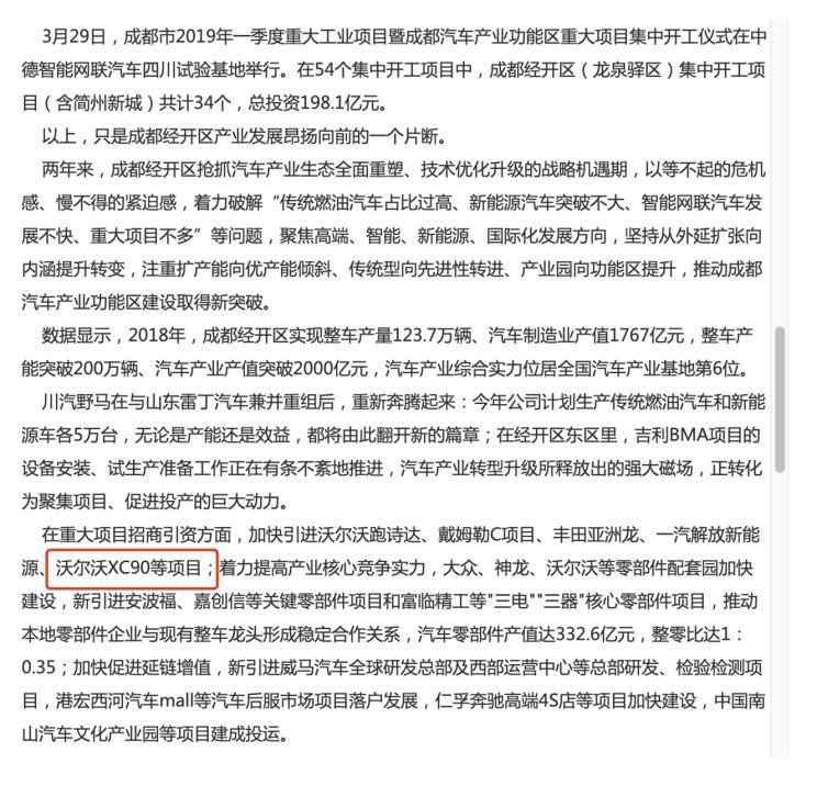 那么转向国内,536中国这一项目则证实了新车的国产计划。根据2019年5月份成都经济技术开发区发布消息显示:在重大项目招商引资方面,加快引进沃尔沃XC90项目。再加上沃尔沃零部件供应商也即将在成都建设工厂,所以新车国产后将极大概率在沃尔沃成都工厂投产。同时有消息称,下一代沃尔沃XC90的投产时间或将为2021年,国产后的整车售价将进一步下调。