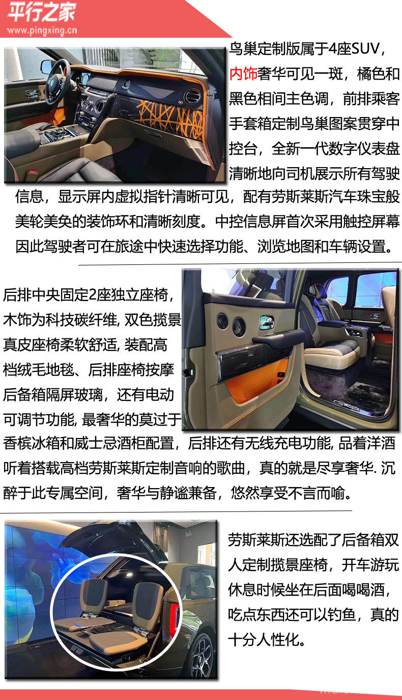 库里南( 参数 | 询价 )是迄今世界上最大的一颗钻石的名字,劳斯莱斯是世界上最著名的品牌之一,两者结合起来可以说是世界上最奢华和尊贵的结合了。近期,劳斯莱斯打造了国内唯一一款全球鸟巢定制版劳斯莱斯库里南堪称地表最豪SUV,豪华的让人无法想象,让我们一起见识一下这款独一无二的尊贵吧。