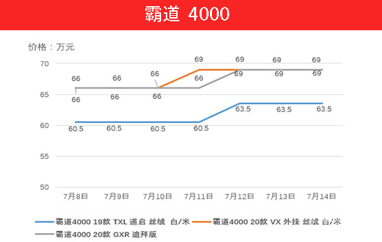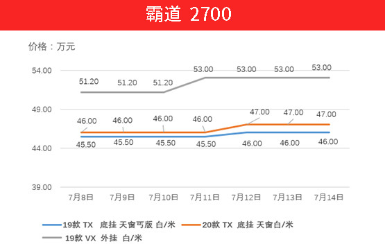 中东版丰田霸道2700,是2017年平行进口车的销量冠军,但是,进入2018年之后,它的好日子就结束了,途乐与帕杰罗的强势崛起着实抢了相当一批霸道的用户。不过,如今三款车型都算是一条绳上的蚂蚱了。上周 19款TX 底挂 天窗 丐版上升5000元,20款TX车型则上升10000元,VX底挂车型更是夸张上升18000元。