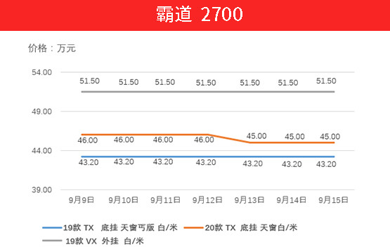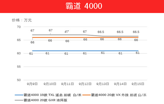 霸道4000走势与2700如出一辙。上周20款迪拜版车型下降5000元。但这个价格预计在年底退市之前还会有一波哄抢。