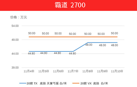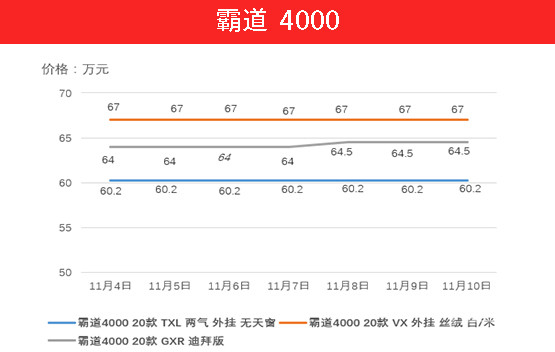 霸道4000凭借霸气的外观可靠的品质让人们趋之若鹜,上周20款GXR迪拜版上涨5000元,VX外挂车型由于已经探到了酷路泽的价格区域并不算好卖,价格不变。