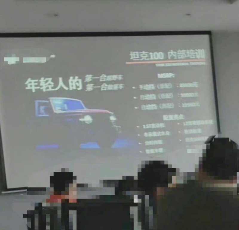 最近,网络上流传着一张,坦克100内部培训的PPT截图照片,这张照片中我们可以比较清晰的看到“坦克100内部培训,年轻人的第一台越野车、第一台敞篷车”等字样,下方还配有一辆敞篷越野车型的图片。同时还可以隐约看到售价以及车型参数等信息。所以很多人就相信,会有坦克100这款车。