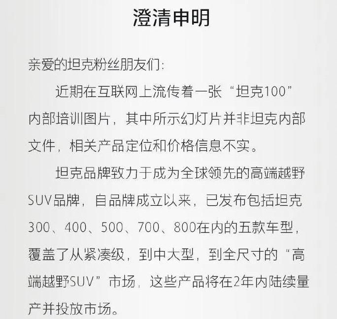 没想到没多久坦克官方就发布了一则澄清声明,表示该图片并非坦克内部文件,里面涉及的产品定位和价格信息也是错误的。并且强调目前坦克系列包括坦克300( 参数 | 询价 )、400( 参数 | 询价 )、500( 参数 | 询价 )、700、800五款车型,除了已经上市的坦克300和以及预售的坦克500之外,其余车型也将在2年内陆续量产并投放市场。