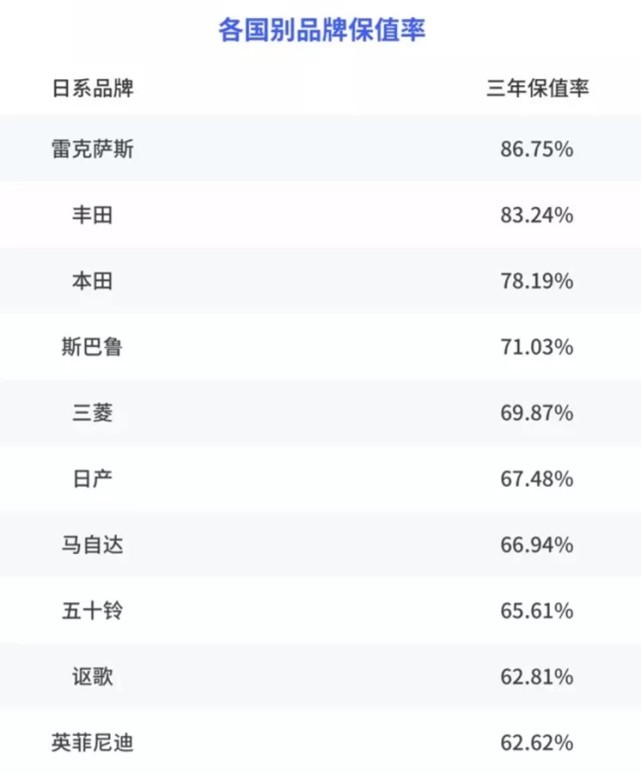 如果从国别来看,日系毫不列外的又排在了第一,三年保值率达到了71.91%;德系排名第二,三年保值率为67.19%;韩系排名第三,三年保值率为61.65%;国产排名第四,三年保值率为58.59%;英系排名第五,三年保值率为56.46%。