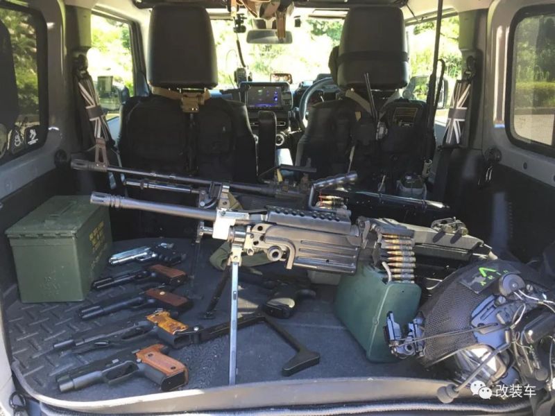 千万别以为这台小D版吉姆尼是个样子货,打开尾门会发现另一个世界,这里有两架重机枪,还有井然有序地放置在盒子中的步枪和手枪,还有什么质疑的话,都往肚子里吞吧。