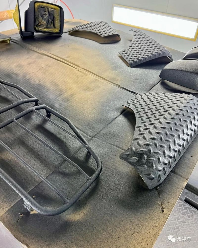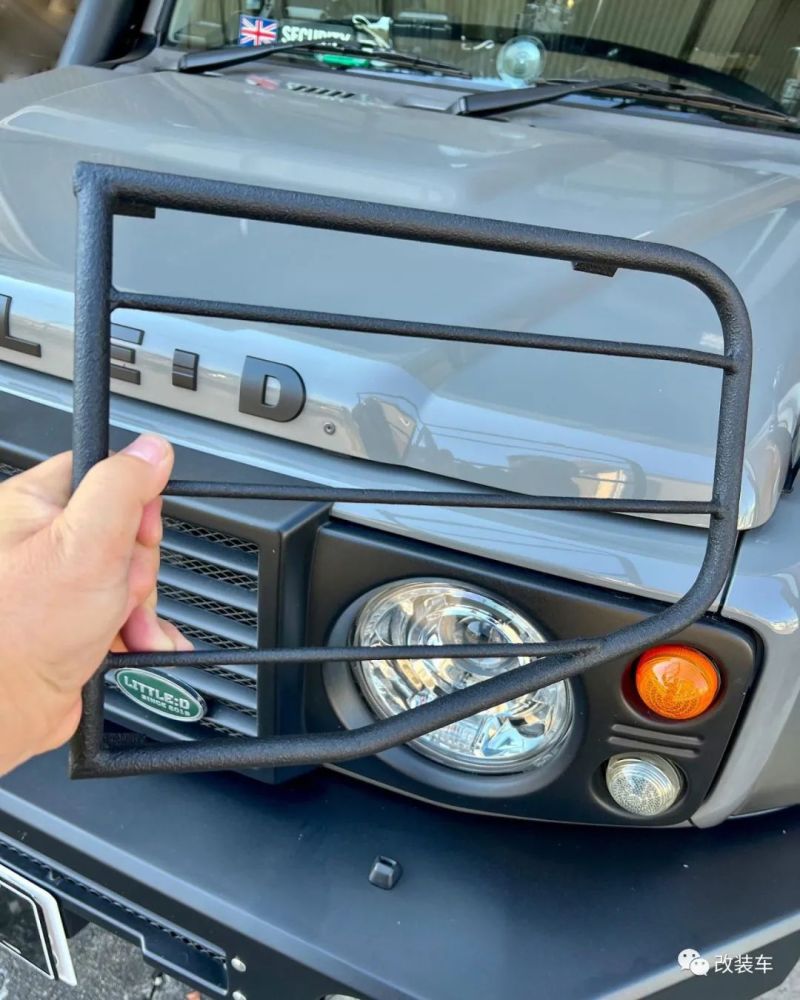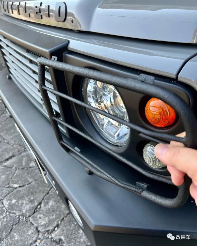 外观为了做得像路虎卫士,横条状的中网和标志性的绿色Logo少不了,还有样式一模一样的防撞前杠,再加两个铁网罩住大灯,小D的前脸就算完工了。