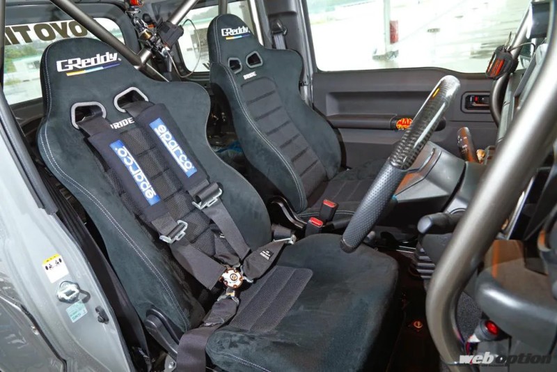 而在操控方面,这台250匹马力的吉姆尼并没有安装LSD限滑差速器,只是改装了一套Bilstein的套装避震器;至于轮胎和轮毂则是选择了16寸的RAYS TE37V(7J ET-5)搭配东洋Open Country R / T (235/70 R16) 轮胎,让这台车越野味儿十足。正因为这样的配置,所以山田英二在上赛道驾驶这台250匹的吉姆尼时,车辆在弯道中可以做出横滑的动作也是着实吓到了。